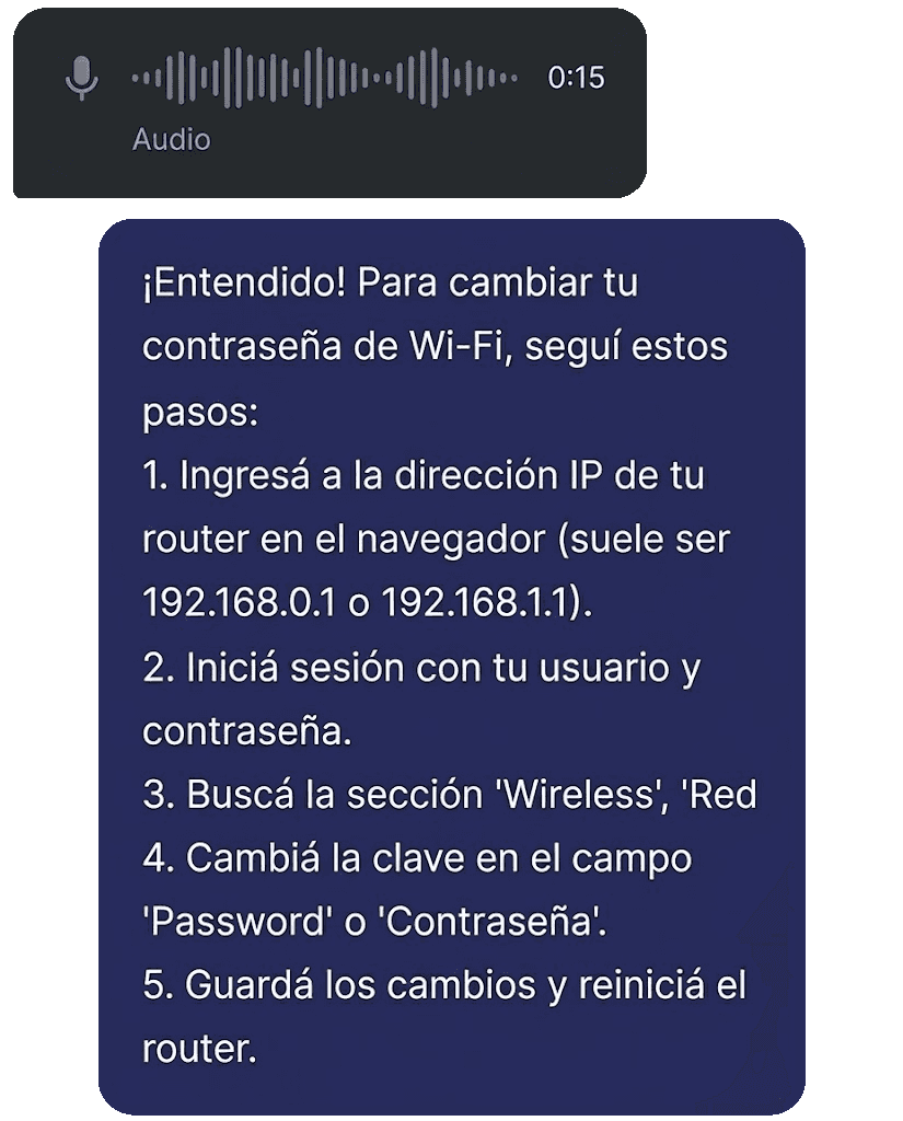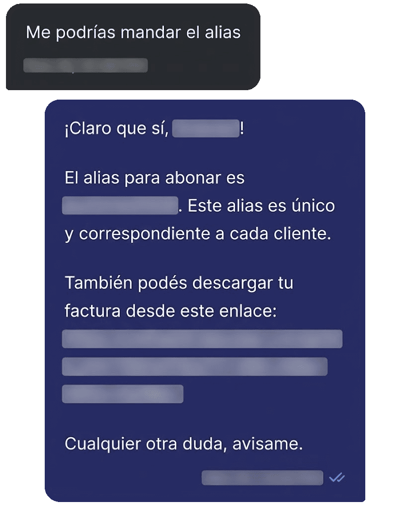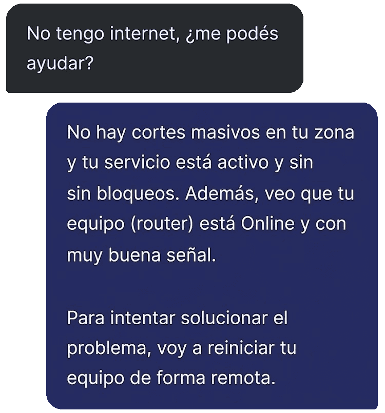 Tus clientes escriben al mismo número de siempre, pero ahora reciben respuestas inmediatas. Autogestión de pagos, soporte técnico y reclamos, resueltos 24/7 sin intervención humana.
